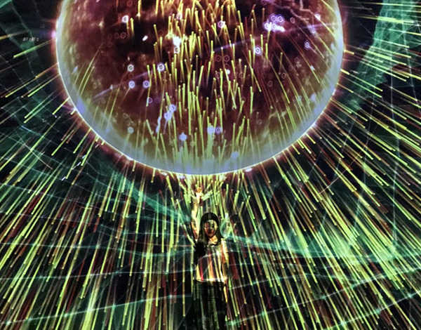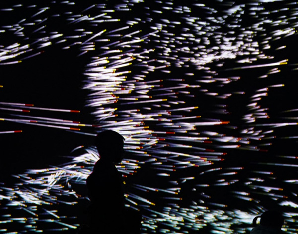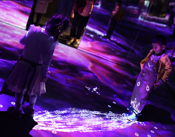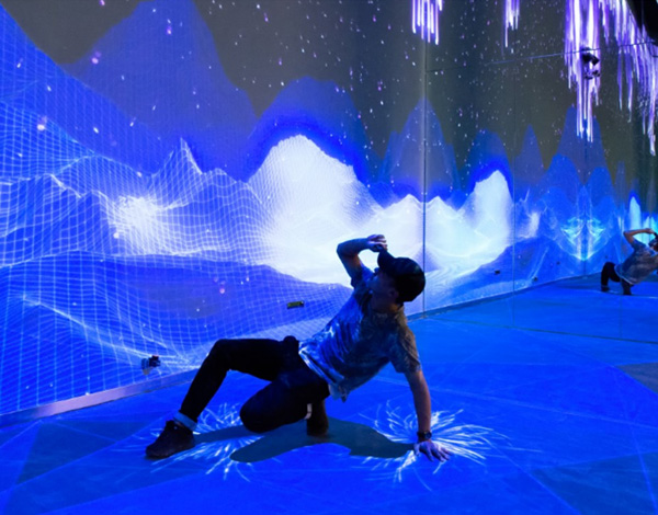 《宇宙共振》,是物理學(xué)概念“共振”的全新詮釋。整屏的粒子象征宇宙的能量,人類和宇宙在某些頻段發(fā)生共振,平行的粒子會(huì)根據(jù)體驗(yàn)者的形體發(fā)生偏移而湍流運(yùn)動(dòng),呈現(xiàn)不同的形態(tài)。用科技手法把物理概念和細(xì)節(jié)體現(xiàn)的淋漓盡致,在沉浸式體驗(yàn)的同時(shí),也了解了“共振”物理知識(shí)。